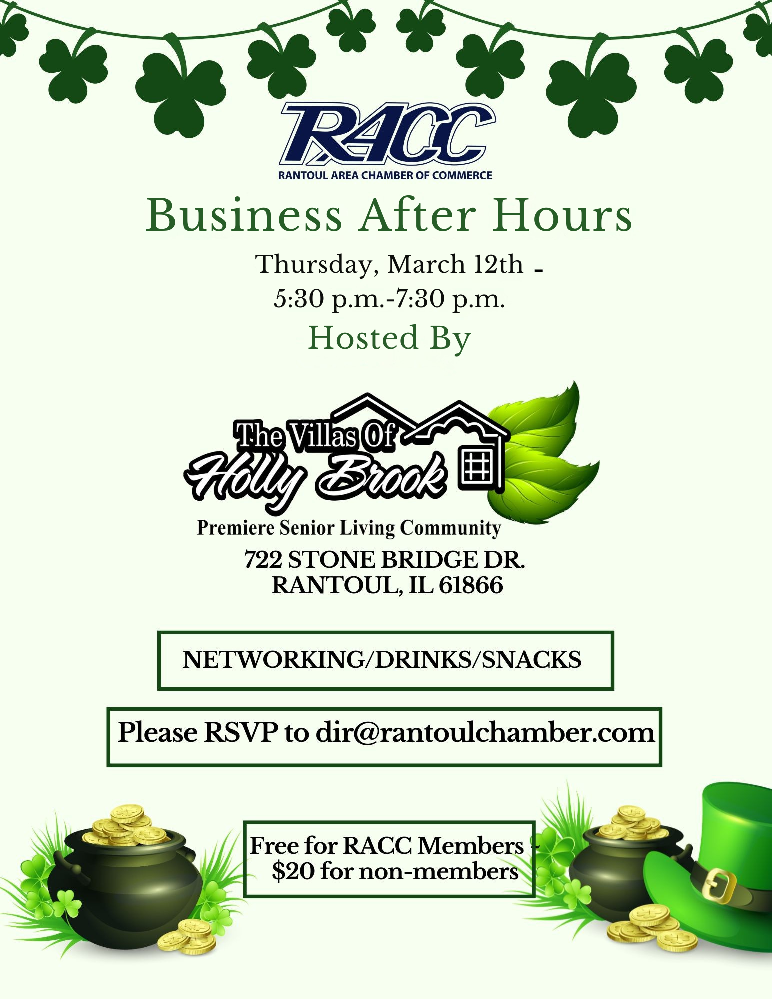 March Business After Hours March 12 @ 5:30 pm - 7:30 pm The Villas of Holly Brook 722 Stone Bridge Dr., Rantoul, IL, United States